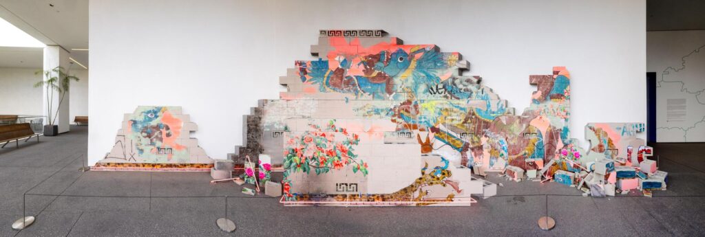 Martinez: The idea of L.A. being ashamed of its past pushed me to work with cinder blocks [in “Battle of the City on Fire”]. One of the main reasons was to bring attention to the East Los Streetscapers, the muralists who painted in East L.A. [in the 1960s and ‘70s as a part of the Chicano Mural Movement]. There was this one mural in Boyle Heights that was painted at a Shell gas station. It was later knocked down and in the demolition pictures, the way the cinder blocks were on the floor looked like a sculptural painting. It prompted me to use cinder blocks as a form of sculpture and think about what kind of modern-day ruins we pass by.