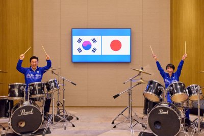 President Lee Jae Myung (L) and Japanese Prime Minister Sanae Takaichi play drums together during an informal meeting that followed their summit talks in Nara, Japan, on Tuesday. Pool photo by Yonhap