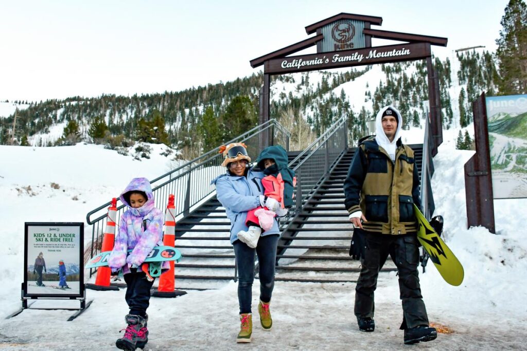 “It’s way family-friendlier than Mammoth,” said Daniel Jones after a day of June Lake snowboarding with Lorena Alvarado and children Gabriela Gonzales, 7, and Amirah Jones, 2. They had come from Riverside, a first-time visit for the kids.