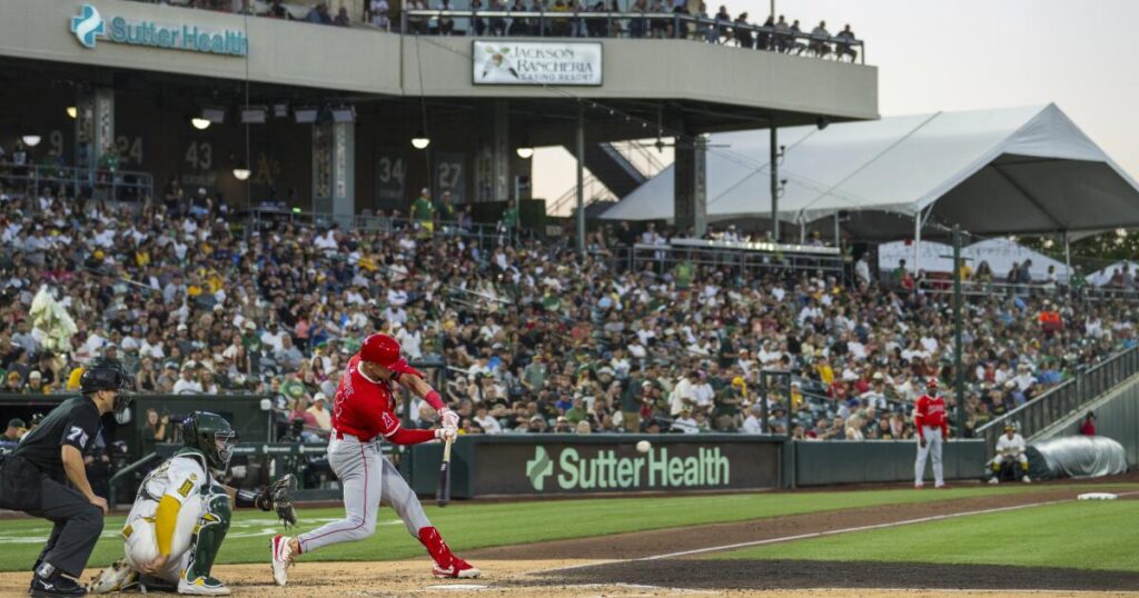 Every homer went over 400 feet, with O’Hoppe’s second-inning two-run blast topping them all at 470, easily leaving Sutter Health Park, the Athletics’ temporary home.