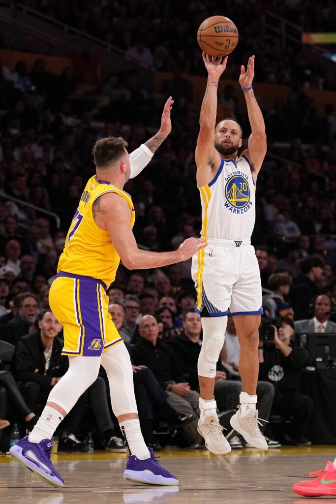 Warriors star Stephen Curry shoots over the Lakers’ Luka Doncic during a game on April 3.