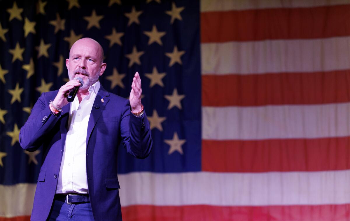 Republican gubernatorial candidate Steve Hilton speaks at a March 7 town hall in Mentone.