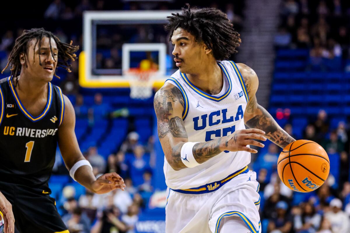 UCLA guard Skyy Clark drives against UC Riverside guard De’Undrae Perteete Jr. during the Bruins’ win on Tuesday.