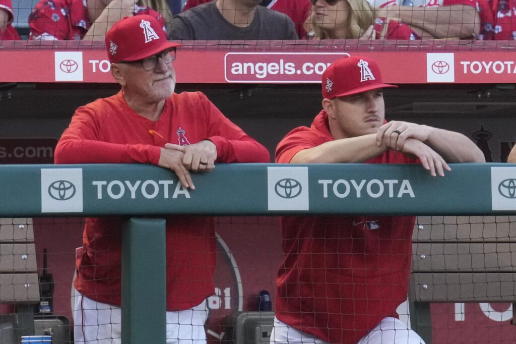 Joe Maddon, left, who was Mike Trout’s manager from 2020-22, said, “If you’re going to scout the perfect player, it would be Mike Trout.”