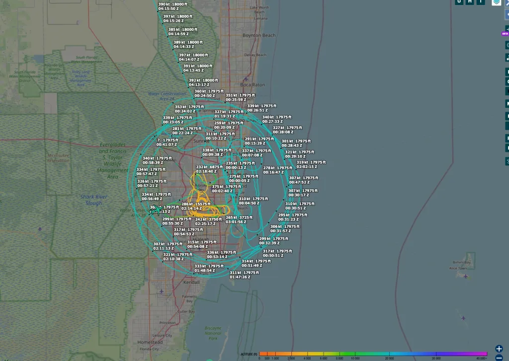 The U.S. Navy P-8 Poseidon maritime patrol jet, callsign JULIET ECHO 191, is seen heading south toward a presidential Combat Air Patrol (CAP) mission to protect President Donald Trump, who attended a college football game in Miami Gardens. (Nick Strader)