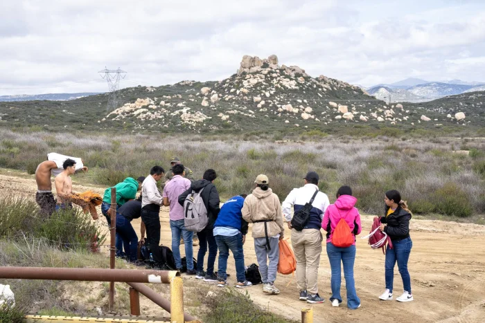 Migrants wait to surrender to U.S. Border Patrol officers after crossing into the United States from Mexico near Campo, Calif., on March 13, 2024. Photo by Pat Benic/UPI | License Photo