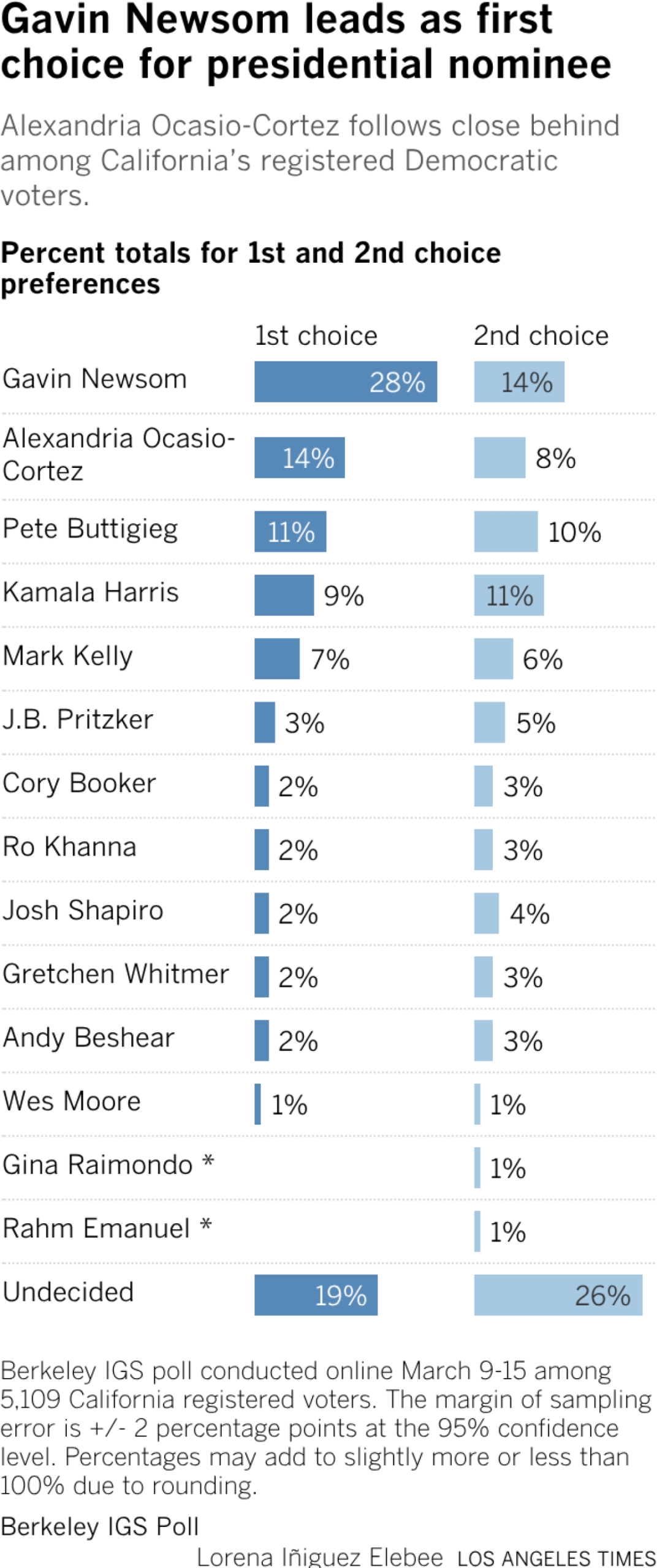 But if the state’s registered Democrats picked now, Newsom would trounce Harris as their party’s next nominee for president and have the edge over other Democratic contenders, according to a poll released Friday by the UC Berkeley Institute of Governmental Studies and co-sponsored by The Times.