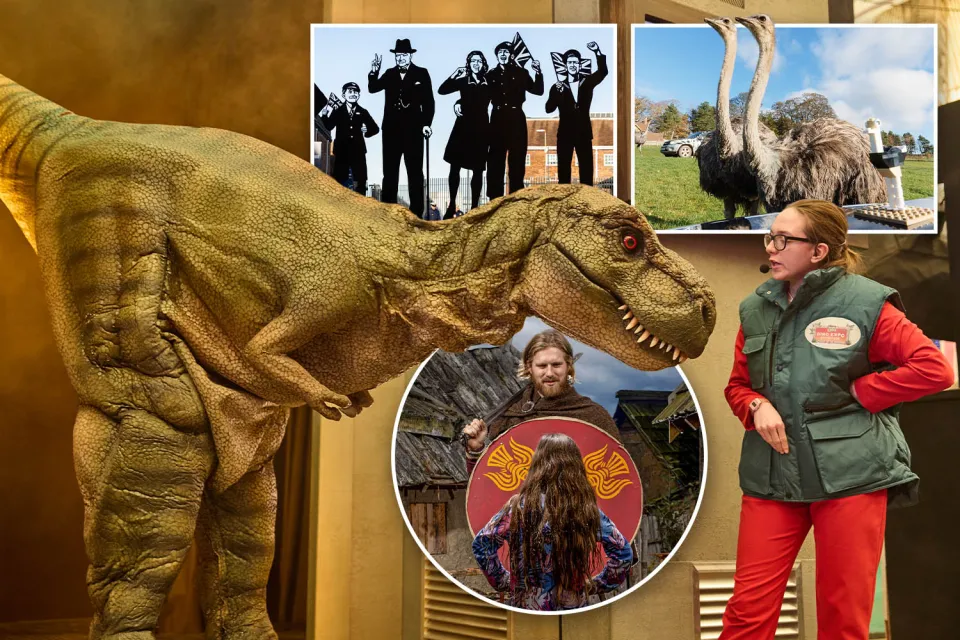 Collage of a dinosaur costume, a person in a "Dino Expo" vest, silhouette cutouts of historical figures, ostriches, and a Viking reenactment.