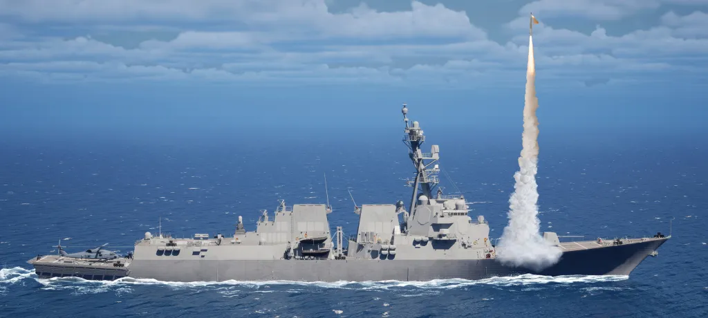 A rendering of an Arleigh Burke class destroyer firing a PAC-3 MSE missile. Lockheed Martin