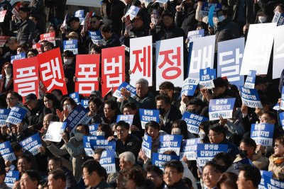 Members of small business and self-employed groups, including the Korea Federation of Food Service Industry, the Korea Lodging Association and the Korea Federation of Micro Enterprises, call for passage of the Online Platform Act and the introduction of a total fee cap on delivery apps at the National Assembly in Seoul on Dec. 1, 2025. Photo by Yonhap News Agency