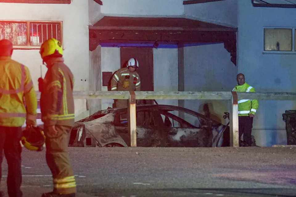 Footage from the scene shows a burnt-out vehicle being dampened by firemen.