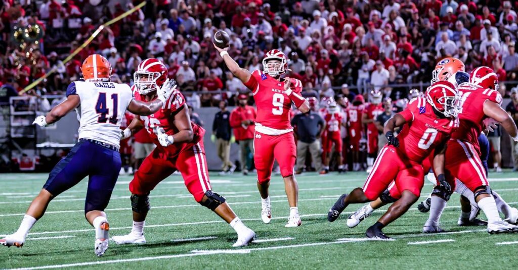 Kodi Greene (No. 75) of Mater Dei blocks last season. He’s one of the nation’s top blockers.