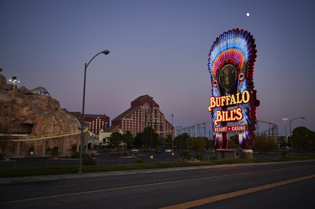 As the sun set just before 8 p.m., the bison-headed neon marquee welcoming visitors to Primm flickered faintly. The animal’s face was dark, though the words “Buffalo Bill’s” remained alight — for now — for the down-on-its-luck resort and casino.