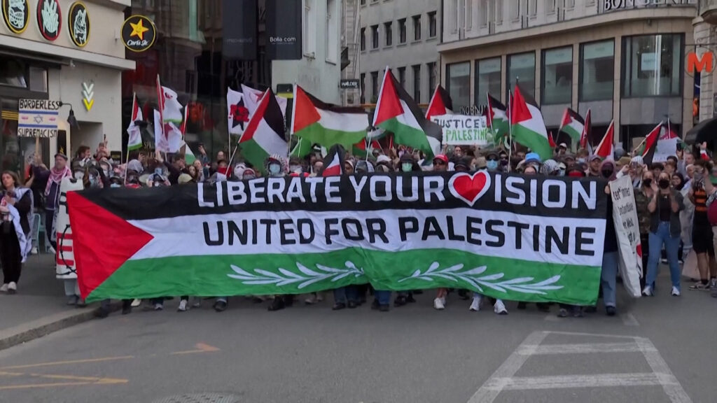 Protesters were assaulted and dragged away for shouting ‘Free Palestine’ and raising the Palestinian flag during Israel’s performance at the Eurovision final. Outside, police attacked demonstrators who said Israel’s violation of international law in Gaza should have ruled them out.