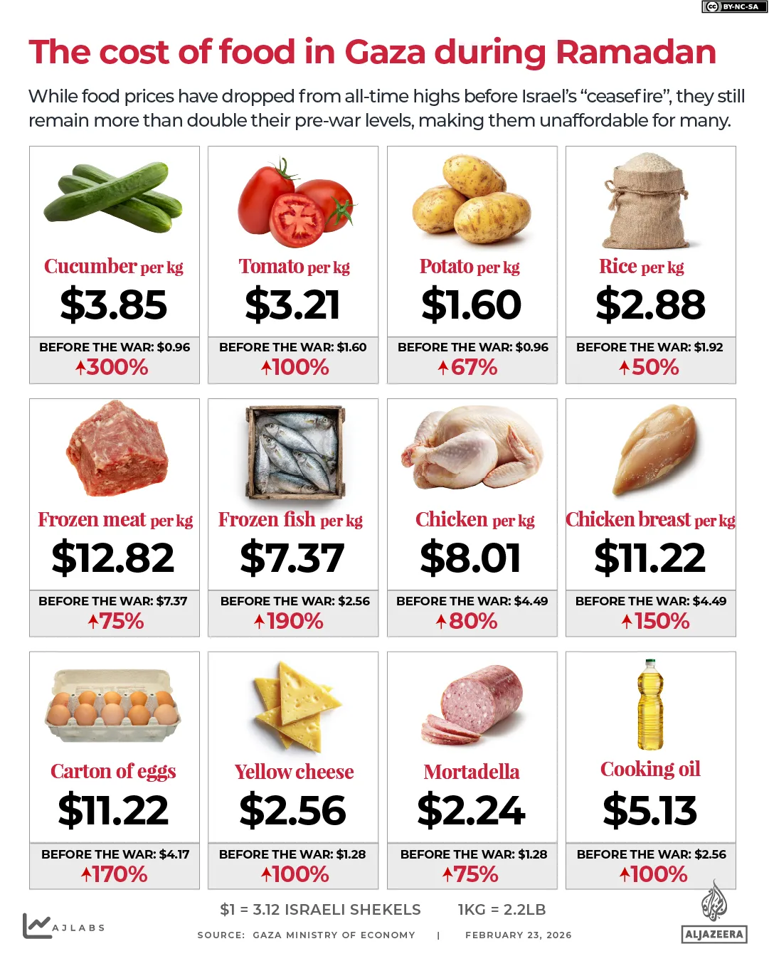 - Chicken: Prices rose from 14 shekels ($4.49) to 25 shekels ($8.01) per kilogramme (2.2lb), an 80 percent increase.