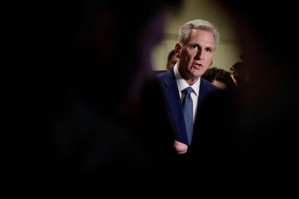 Former Speaker of the House and California Republican Kevin McCarthy speaks to the press at the U.S. Capitol in Washington, D.C., on Oct. 19, 2023.