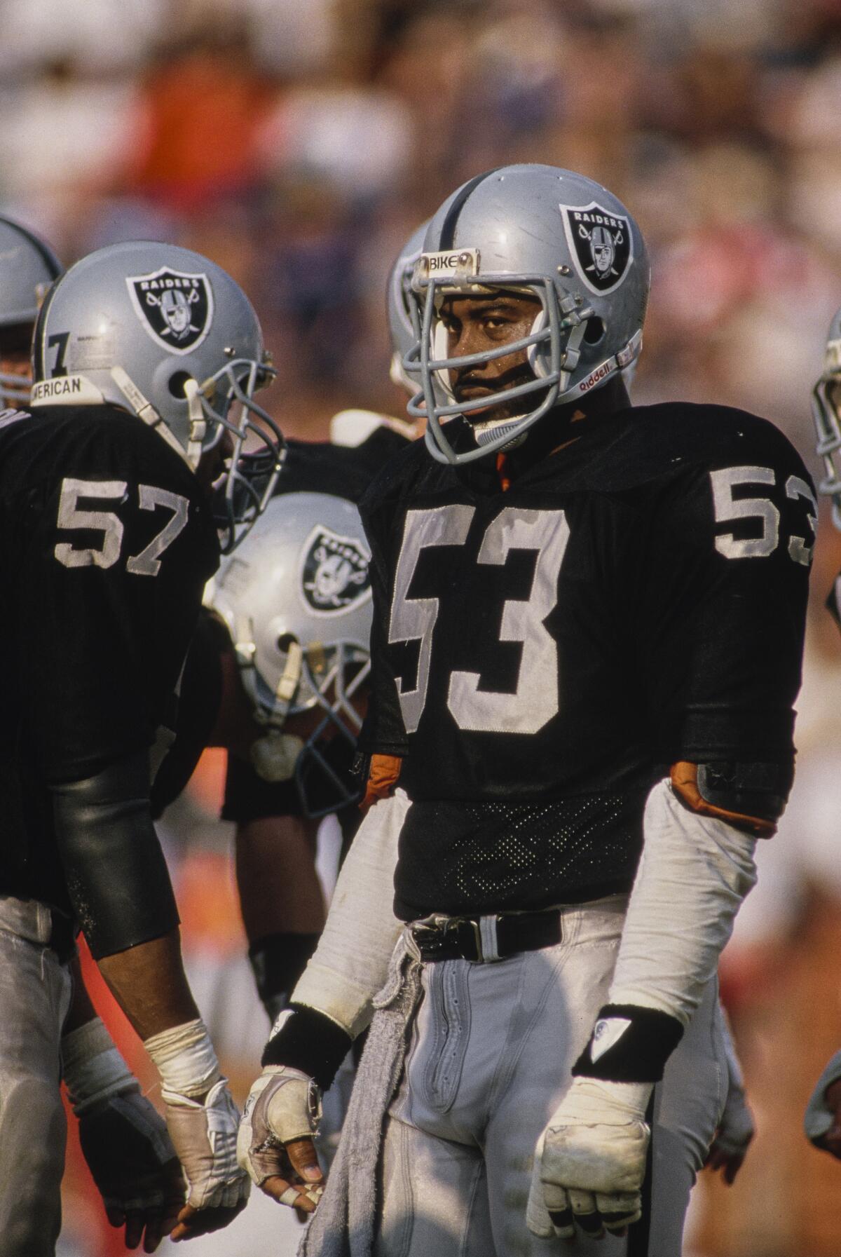 Raiders linebacker Rod Martin stands on the field during a game against the Buffalo Bills on Dec. 6, 1987, at the Coliseum.