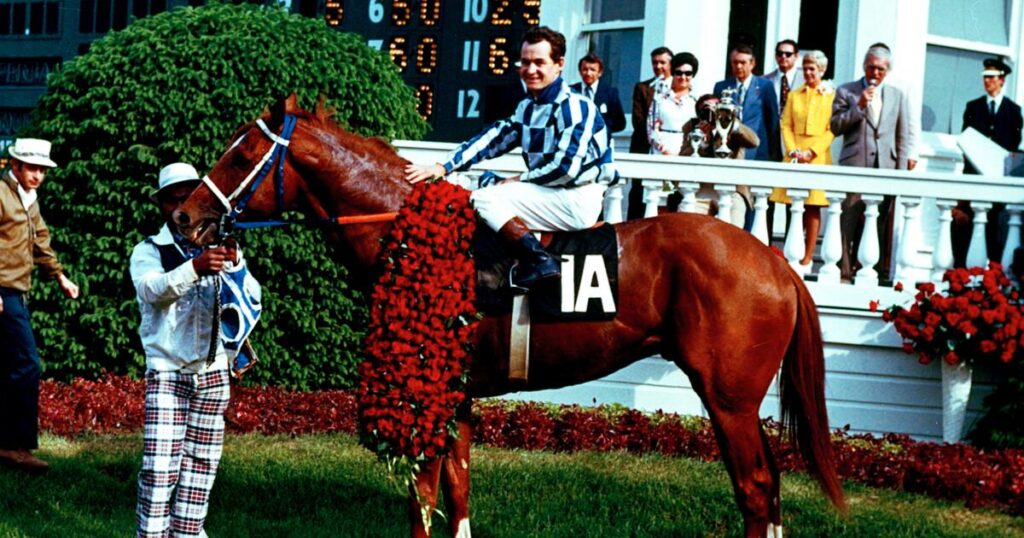 “I couldn’t hear the announcer all the time, saying how far I was in front,” Turcotte told The Times in 2023, to mark the 50th anniversary of Secretariat winning the Triple Crown. “I knew I was quite a ways in front because I couldn’t hear any other horses hitting the ground behind me. When I got the quarter pole I looked and I could barely see them and I looked at the clock and saw 1:59 on the board, which was faster than we ran the Derby.”