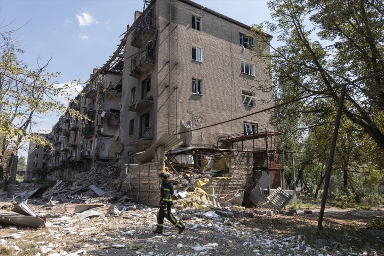 Ukrainian emergency service workers extinguish a fire in a residential building after Russian shelling, in Kostiantynivka, Ukraine, on Saturday [Diego Herrera Carcedo/Anadolu]