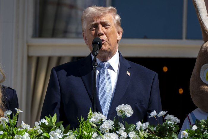 President Donald Trump speaks during the annual Easter Egg Roll on the South Lawn of the White House in Washington on April 6, 2026. Photo by Bonnie Cash/UPI | License Photo