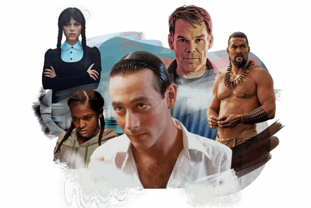 Jenna Ortega in “Wednesday” Season 2; Dominique Thorne in “Ironheart”; Paul Reubens as Pee-wee Herman; Michael C. Hall in “Dexter: Resurrection”; Jason Momoa in “Chief of War.”
