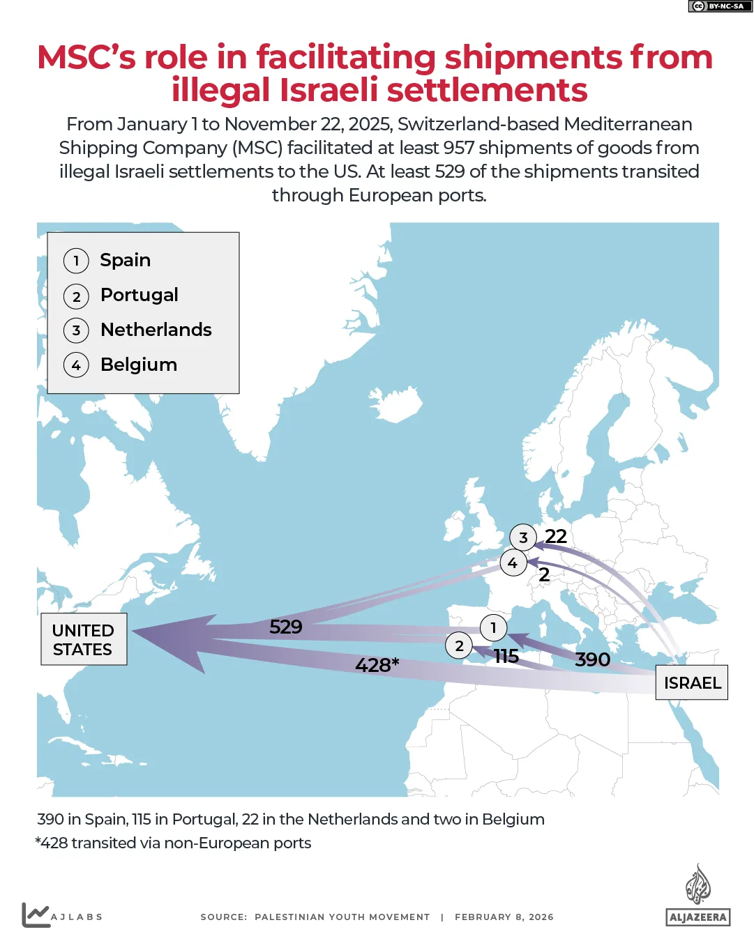 Between January 1 and November 22, 2025, lading bills show that MSC facilitated at least 957 shipments of goods from Israeli outposts to the US. Of these shipments, 529 transited through European ports, including 390 in Spain, 115 in Portugal, 22 in the Netherlands, and two in Belgium.