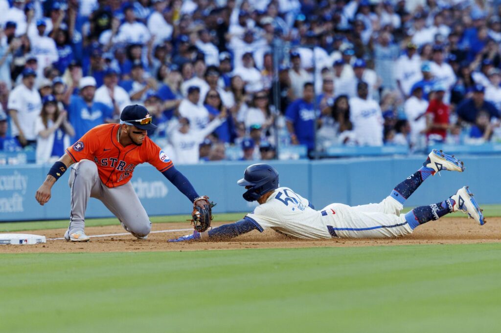 Dodgers shortstop Mookie Betts is tagged out by Houston Astros third base Isaac Paredes while trying to stretch a double into a triple at Dodger Stadium on Saturday.