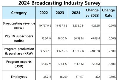 The Korea Communications Commission said total broadcasting industry revenue in 2024 fell 0.7% from 2023 to 18.832 trillion won (about $14.5 billion) in its “2024 Survey on the Status of the Domestic Broadcasting Industry.” The market first turned negative in 2023 after expanding every year since 2003, the commission said.