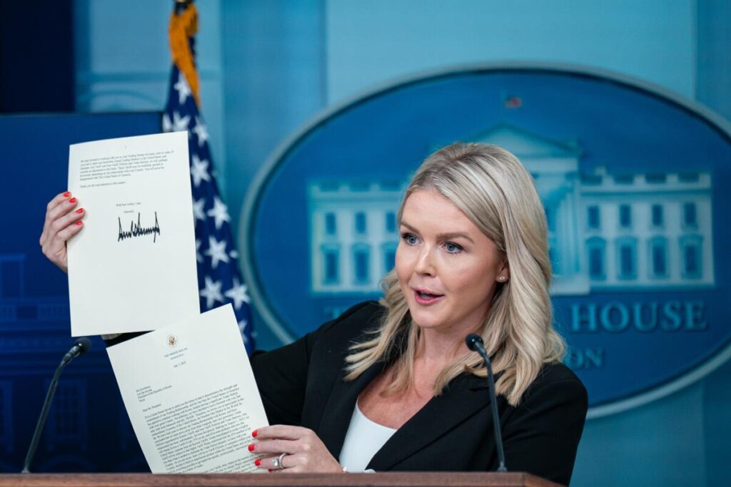 Karoline Leavitt, White House press secretary, holds a trade letter sent by the White House to South Korea during a news conference. On July 30, the U.S. struck a trade deal with South Korea, but details have been scant.
