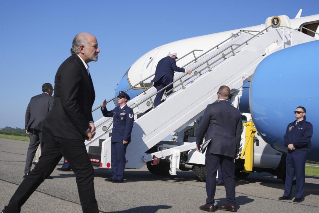 Commerce Secretary Howard Lutnick, left, walks across the tarmac on Sunday as President Trump boards Air Force One. On Monday, Trump dictated new tariff rates to 14 countries, including a 25% tax on South Korea.