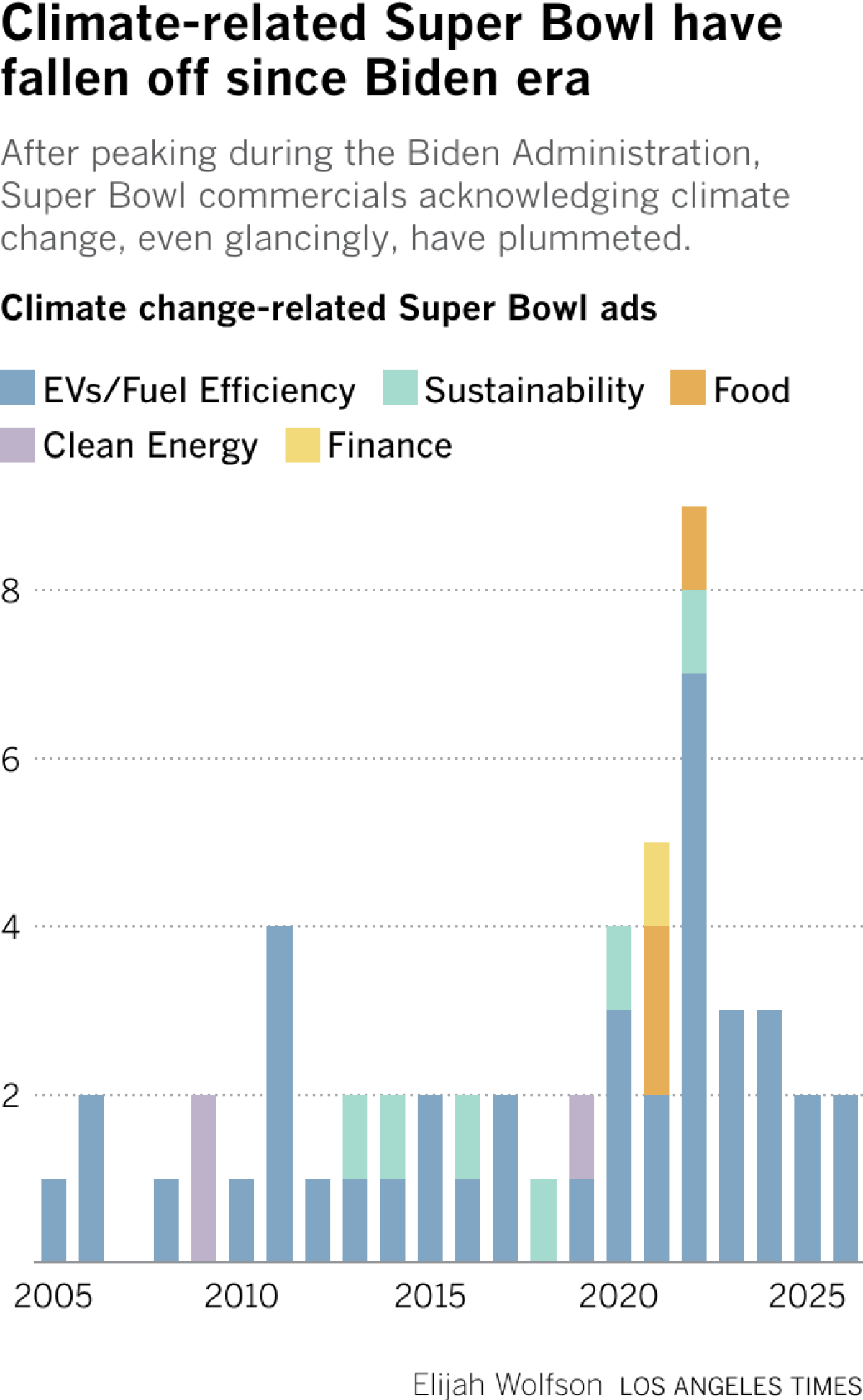 So it’s no surprise that in 2026, the second year of Trump’s second presidency, there was just one Super Bowl ad for a domestically produced green product — and it wasn’t even entirely green. Indeed, it reflects a recent trend across the U.S.: Since the federal clean-vehicle tax credits expired in September, sales of purely electric vehicles have plummeted, while those of hybrids have continued to grow, according to the U.S. Energy Information Administration.