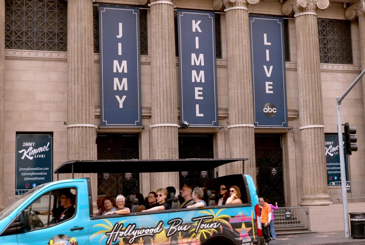 A tour bus drives past what was Jimmy Kimmel’s studio on Hollywood Boulevard on Sept. 18, 2025.