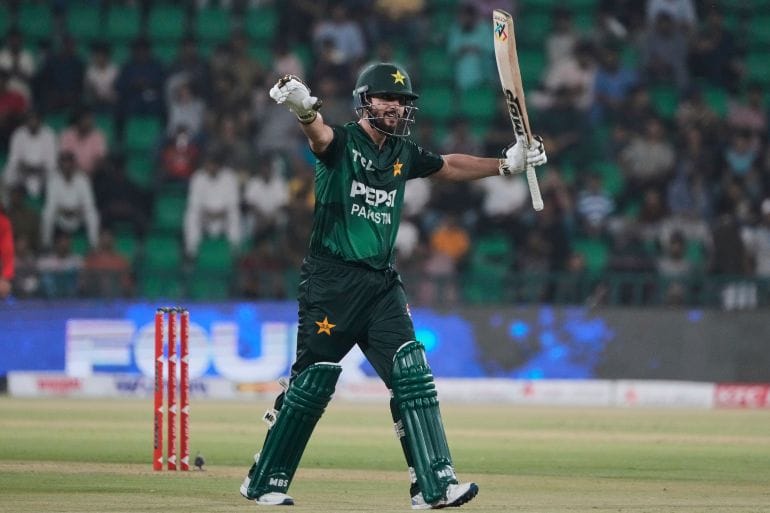 Pakistan’s Salman Ali Agha celebrates after scoring fifty [KM Chaudary/AP]