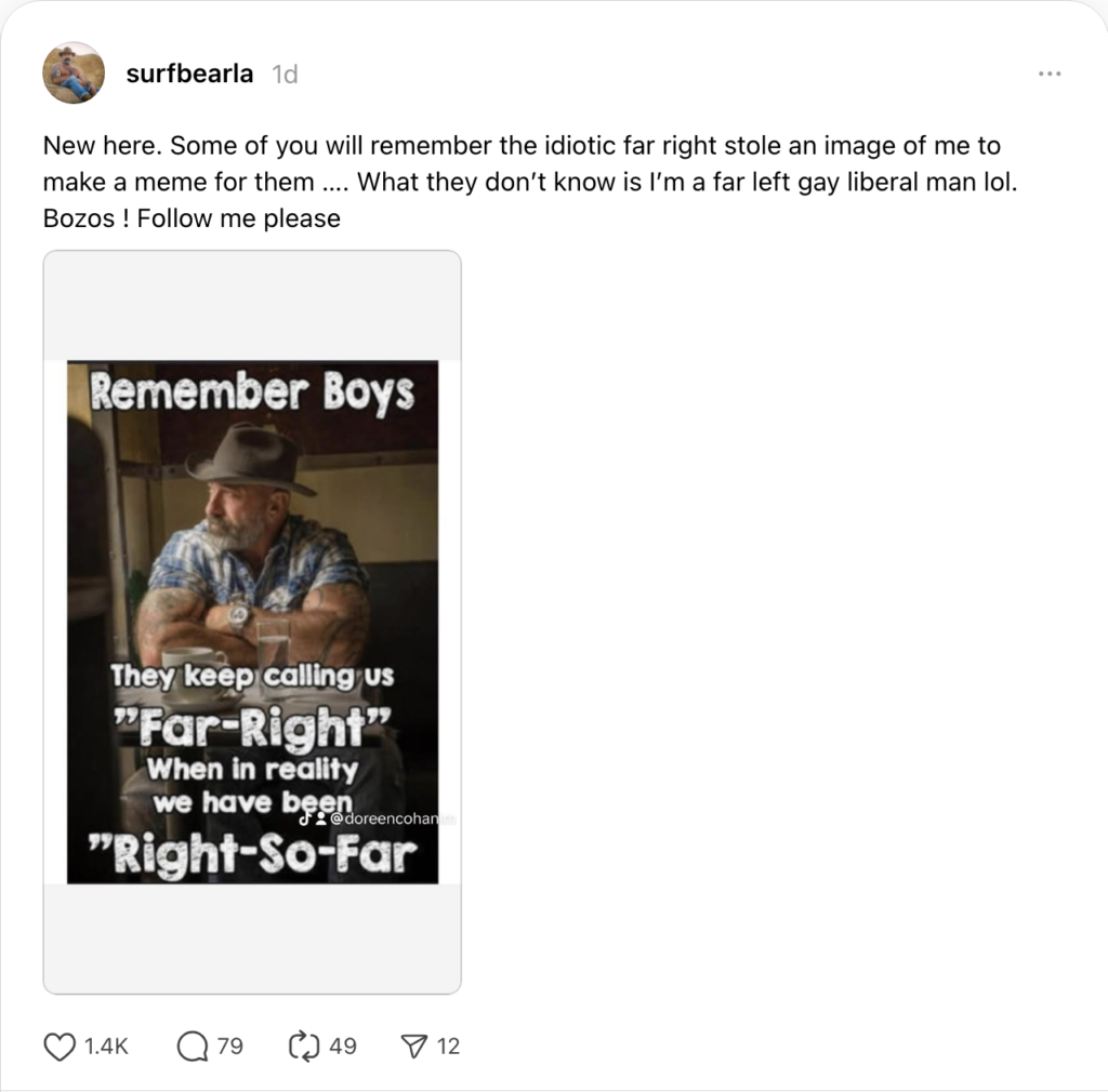 “Remember boys, they keep calling us ‘far-right’ when in reality we have been ‘right-so-far,’ the meme says alongside a photo of Gordon pensively staring off camera in a flannel shirt and cowboy hat.