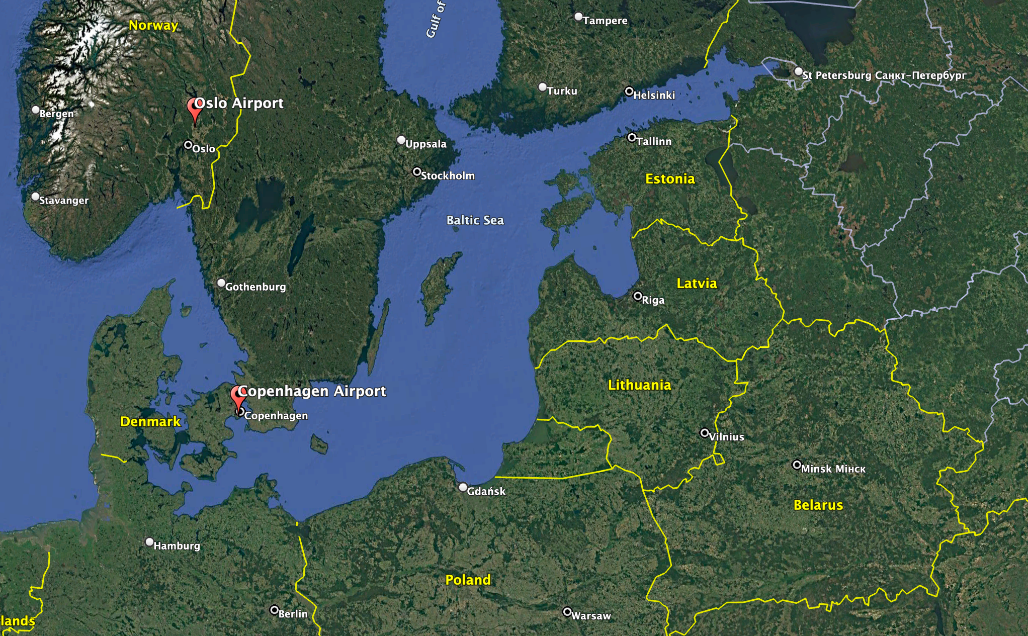The approximate locations of Copenhagen and Oslo Airports. Google Earth