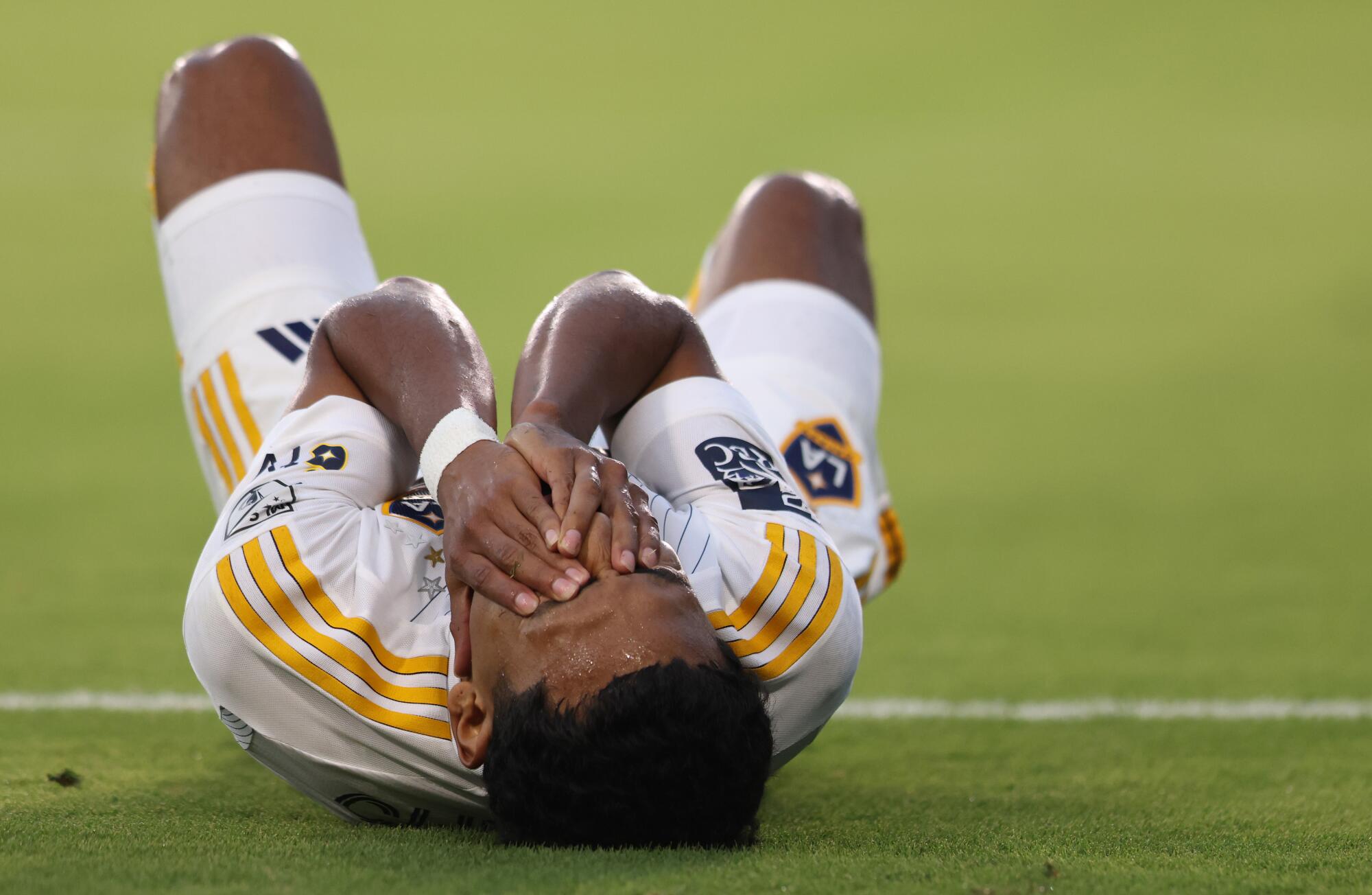 The Galaxy's Mauricio Cuevas lies on the field and covers his face with his hands during his team's 4-0 loss.