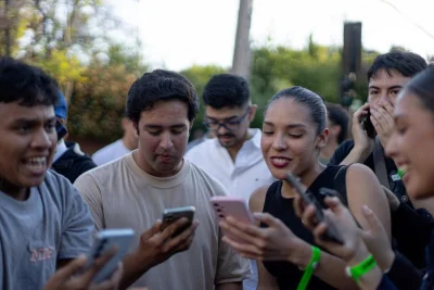 Supporters of Chilean presidential candidate Jose Antonio Kast look at their phones while awaiting election results in Santiago on November 16, aided by a fast Internet. Photo by Ailen Diaz/EPA