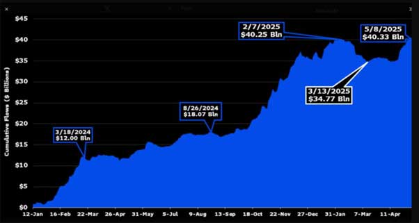 The institutional money flooding into Bitcoin right now is absolutely staggering. ETF inflows have just smashed through $40.33 billion, according to Bloomberg data shared by analyst James Seyffart, with May 8th alone setting records for single-day buying.