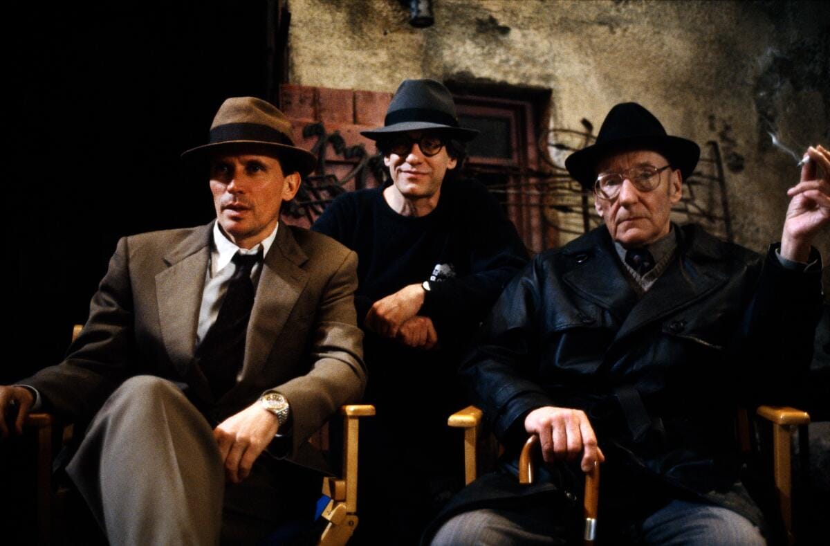 Actor Peter Weller, left, and author William Burroughs, right, with director David Cronenberg on the set of the 1991 movie “Naked Lunch,” loosely based on Burroughs’ drug-infused novel of the same title.