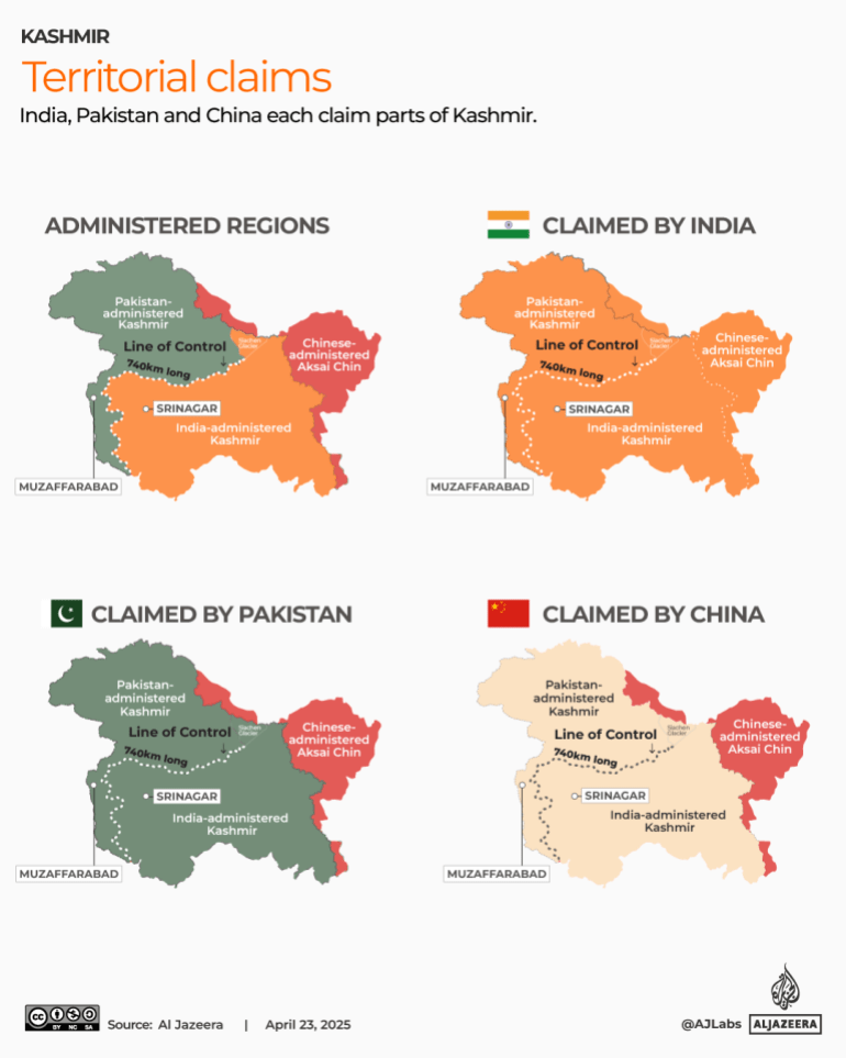 India and Pakistan each administer parts of Kashmir, while China controls two small regions. India claims the entire territory; Pakistan claims the portion administered by India, but not the areas held by its ally China.