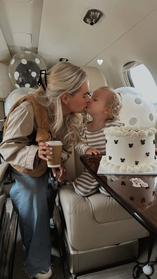 A mother and her toddler kiss on a private jet; a birthday cake sits on a nearby table.