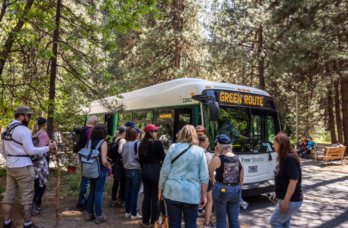 Visitors board buses in Yosemite National Park on May 20. Reported bookings around Yosemite National Park were down 50% leading into Memorial Day weekend.