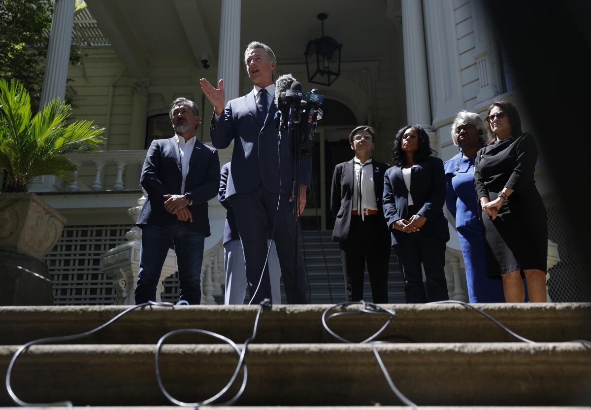 California Gov. Gavin Newsom, shown with Democratic lawmakers from Texas, speaks during a news conference in Sacramento on Friday.