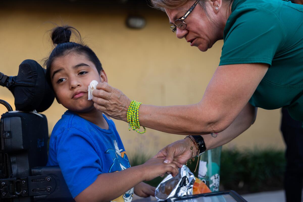 Josephine Rios wipes her grandson Elijah’s face.