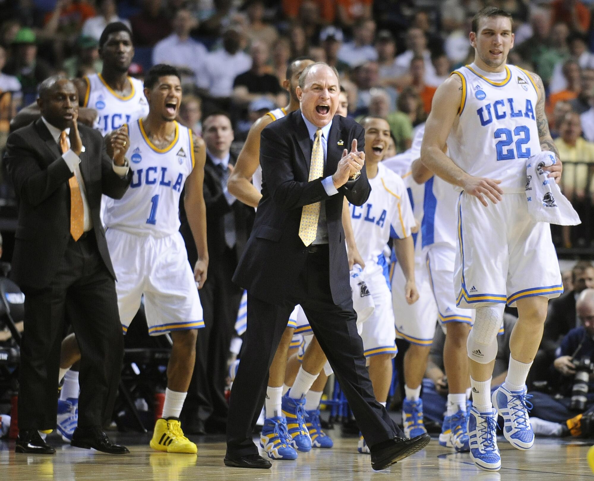 UCLA coach Ben Howland celebrates after a basket by Malcolm Lee against Michigan State in the 2011 NCAA tournament.