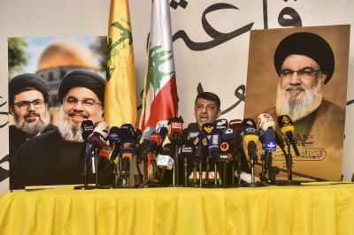 Hezbollah spokesman Mohammad Afif speaks in front of a portrait of late Hezbollah chief Hassan Nasrallah, during a press conference in south Beirut, on Monday on November 11, 2024, amid the ongoing war between Israel and Hezbollah. File Photo by Fadel Itani/UPI | License Photo