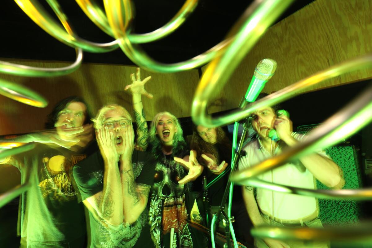 Josh Menashe, from left, Dylan Sizemore, Nicole “Nikki Pickle” Smith, Jon Modaff and Nick Aguilar, of the Los Angeles psych-rock band Frankie and the Witch Fingers get into character in their rehearsal space in Vernon on July 11, 2025.