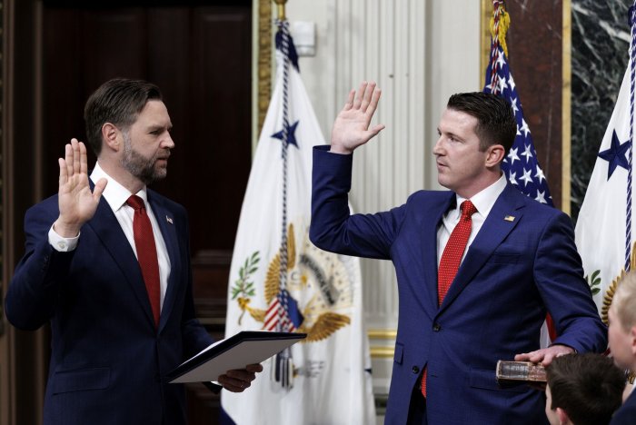 Vice President JD Vance swears in Colin McDonald as assistant attorney general for national fraud enforcement in the Eisenhower Executive Office Building on Wednesday. Pool Photo by Will Oliver/UPI | License Photo