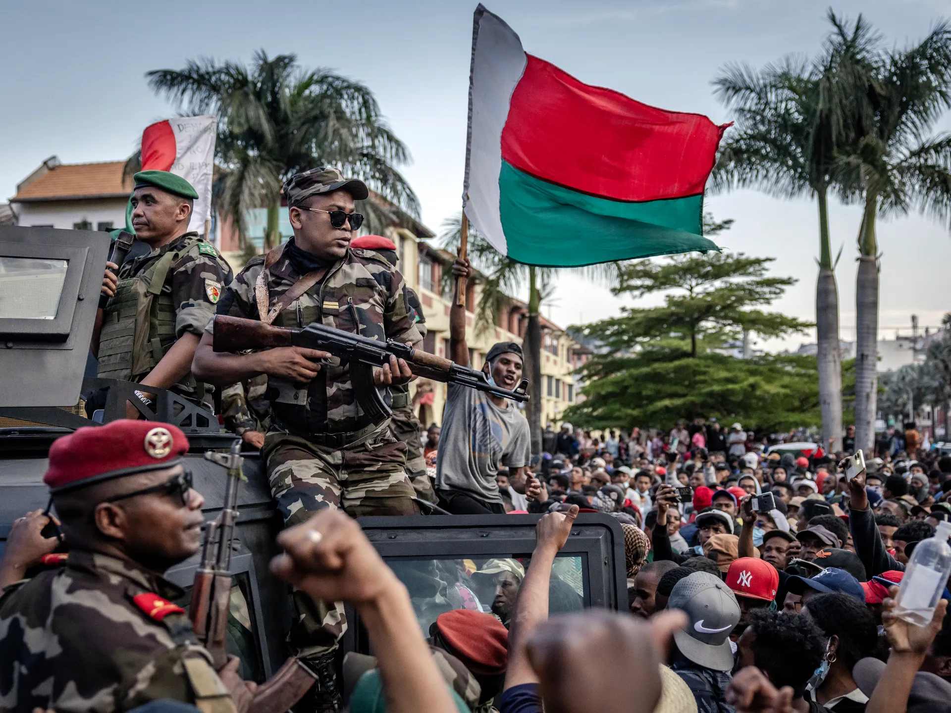 They were greeted with cheers from protesters, who called out, “Thank you!” to the uniformed soldiers, some waving Madagascar flags.