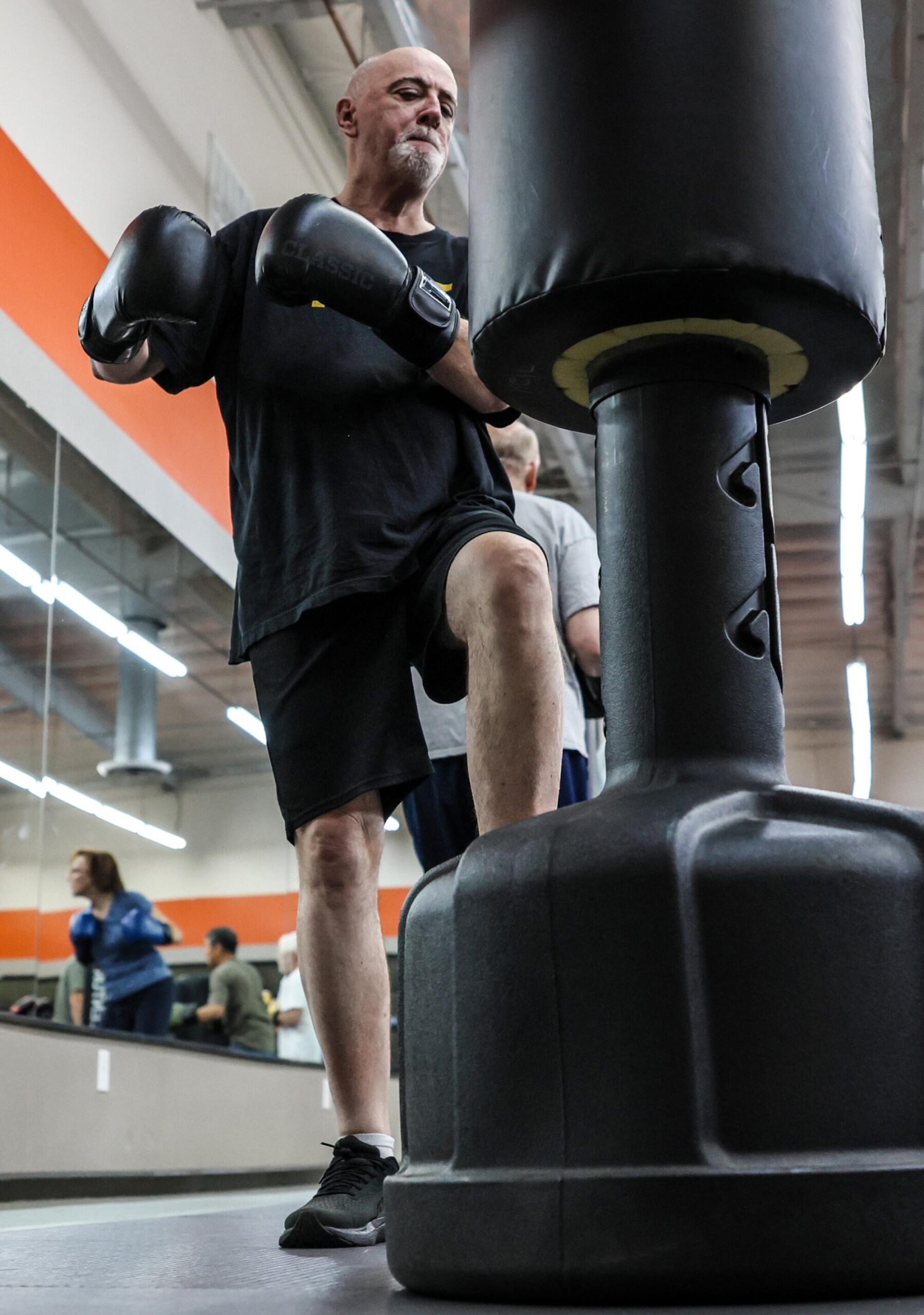 Bill Plaschke participates in a boxing class for people with Parkinson’s disease at Kaizen Martial Arts Studio.